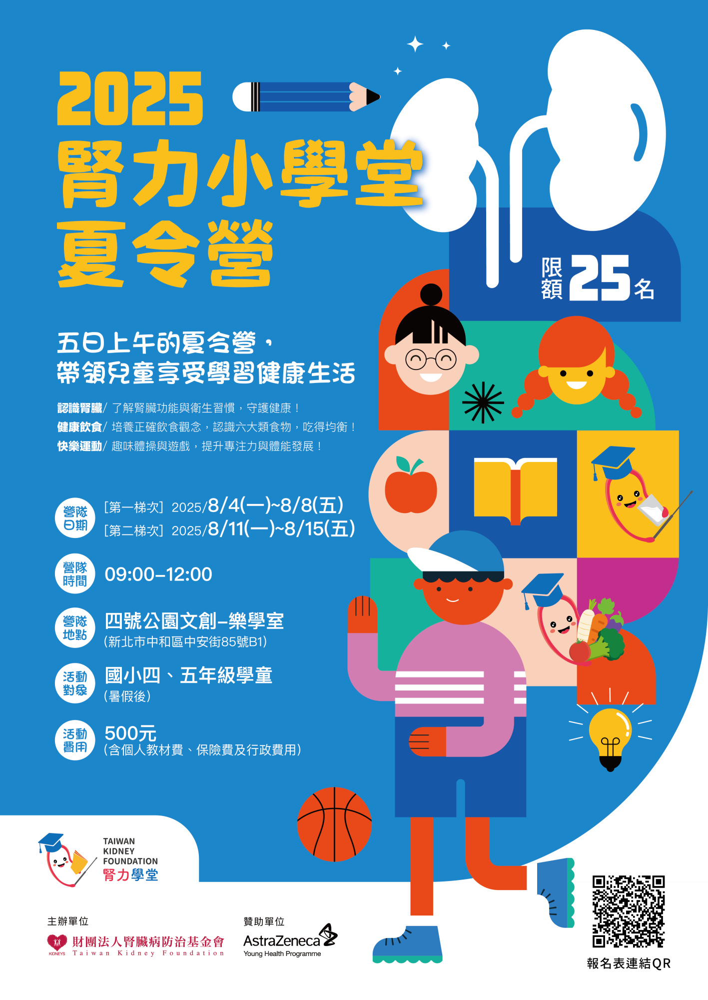 - 活動為公益性質且名額有限,為確保資源公平分配、讓更多孩童受益,已參加過2023、2024腎力小學堂夏令營者請勿再次報名。